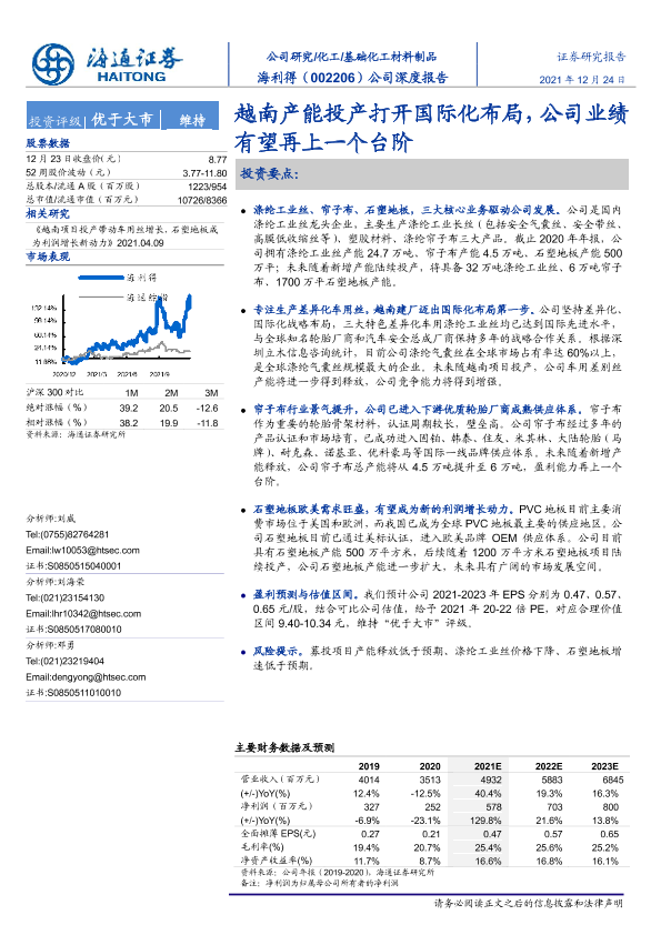 【海通证券】【20211224】海利得-002206.SZ-公司深度报告:越南产能投产打开国际化布局,公司业绩有望再上一个台阶-22页