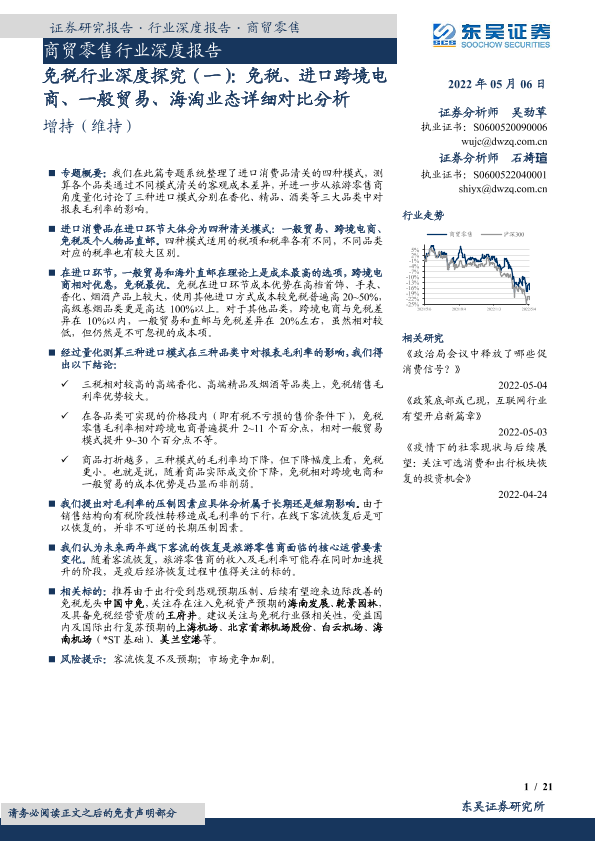 【东吴证券】【20220506】商贸零售行业深度报告:免税行业深度探究(一),免税、进口跨境电商、一般贸易、海淘业态详细对比分析-21页