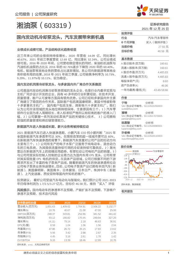 【天风证券】【20211225】国内发动机冷却泵龙头,汽车发展带来新机遇-20页
