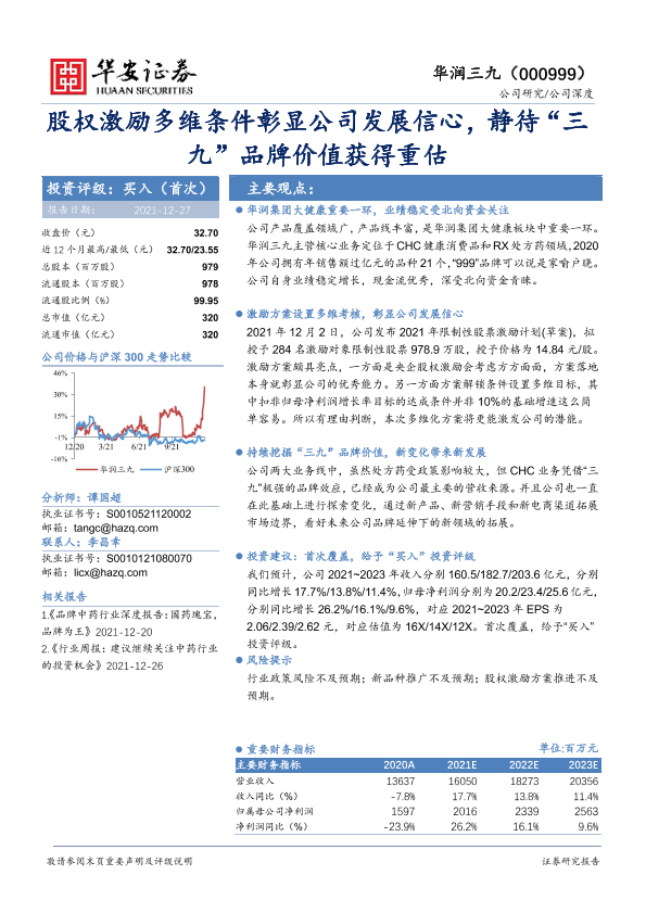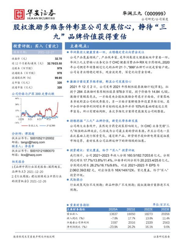 【华安证券】【20211227】股权激励多维条件彰显公司发展信心,静待“三九”品牌价值获得重估-23页