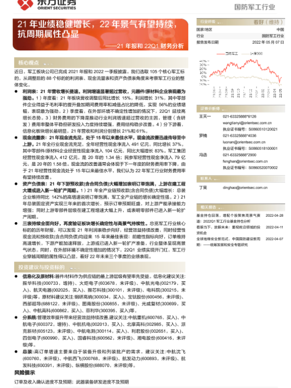 【东方证券】【20220507】国防军工行业21年报和22Q1财务分析:21年业绩稳健增长,22年景气有望持续,抗周期属性凸显-26页