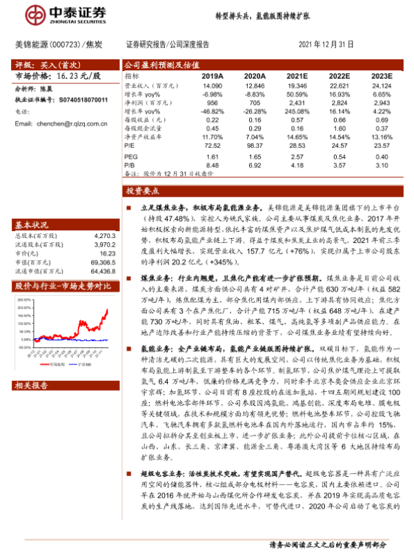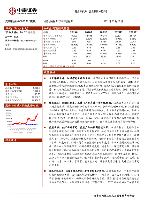 新能源转型 氢能 煤炭焦化 美锦能源 财务预测