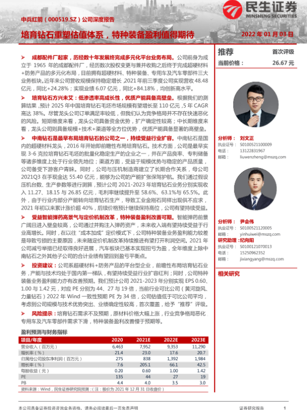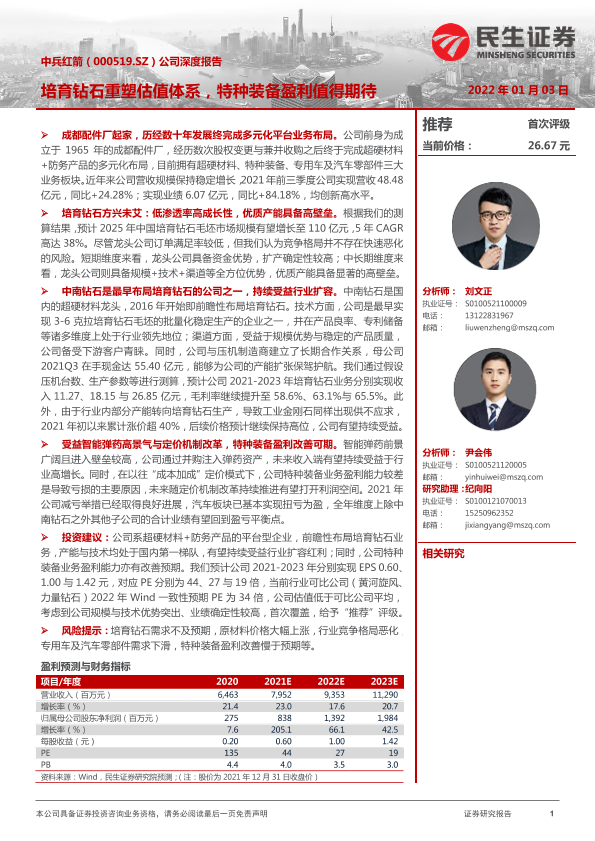 【民生证券】【20220103】中兵红箭(000519.SZ)公司深度报告:培育钻石重塑估值体系,特种装备盈利值得期待-26页