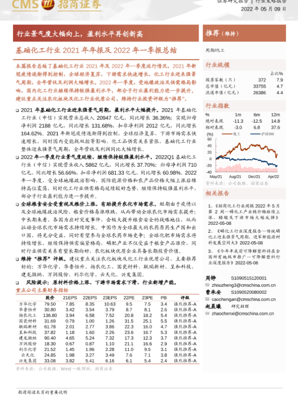 【海通证券】【20220509】基础化工行业2021年年报及2022年一季报总结:行业景气度大幅向上,盈利水平再创新高-26页