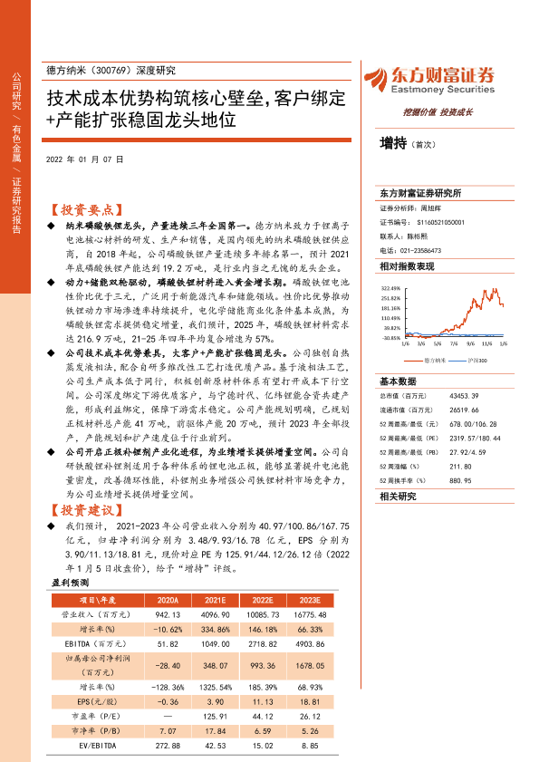 【东方财富证券】【20220107】德方纳米-300769.SZ-深度研究:技术成本优势构筑核心壁垒,客户绑定+产能扩张稳固龙头地位-34页