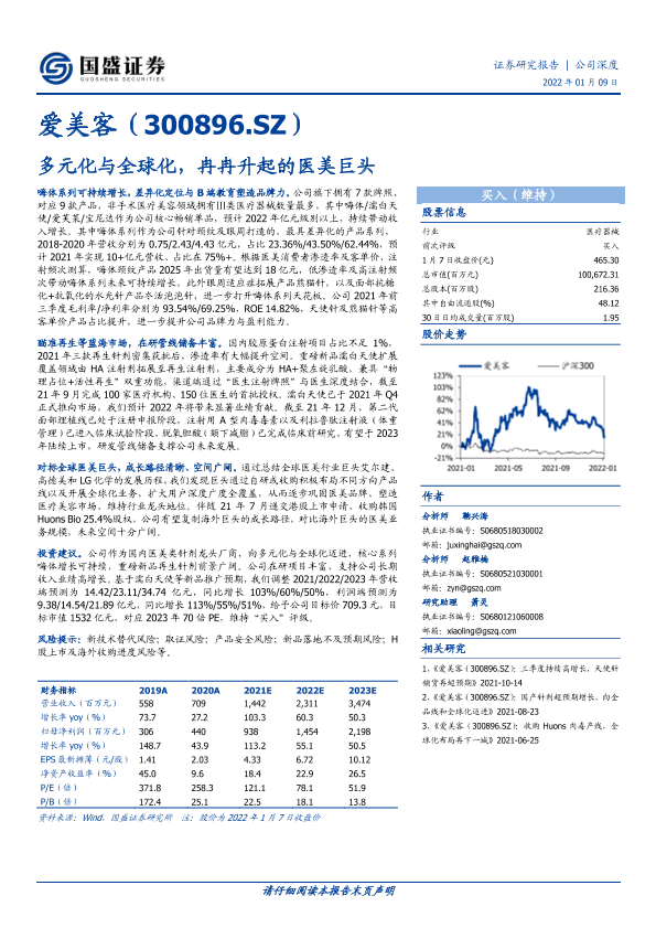 全球化战略 再生针剂 医美行业 嗨体系列 财务预测