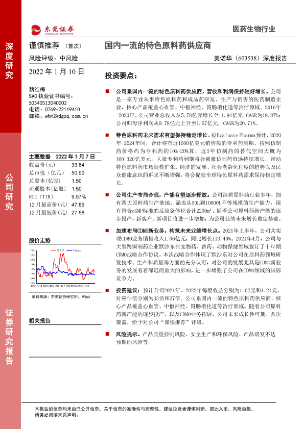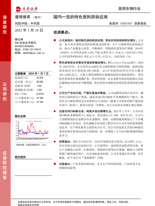 【东莞证券】【20220110】20220110-东莞证券-美诺华-603538.SH-深度报告:国内一流的特色原料药供应商-24页