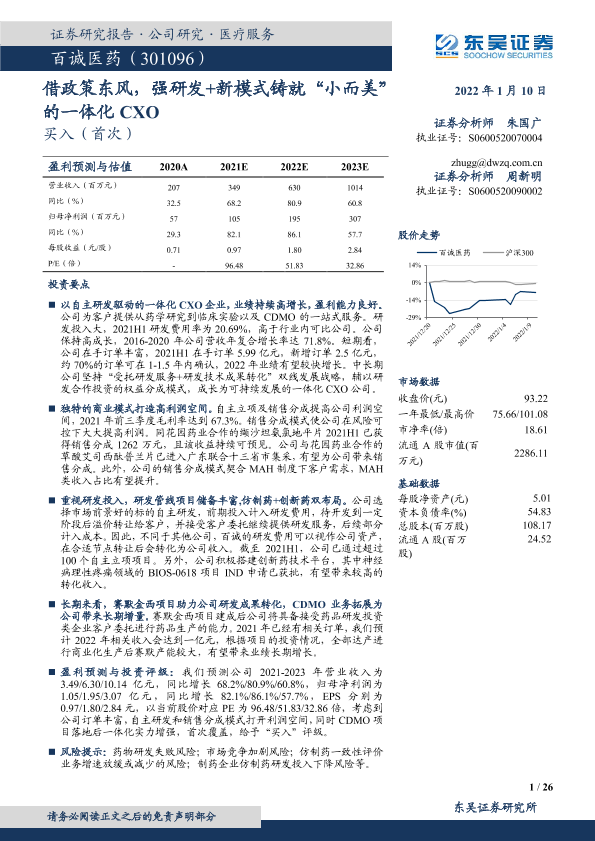【东吴证券】【20220110】20220110-东吴证券-百诚医药-301096.SZ-借政策东风,强研发+新模式铸就“小而美”的一体化CXO-26页