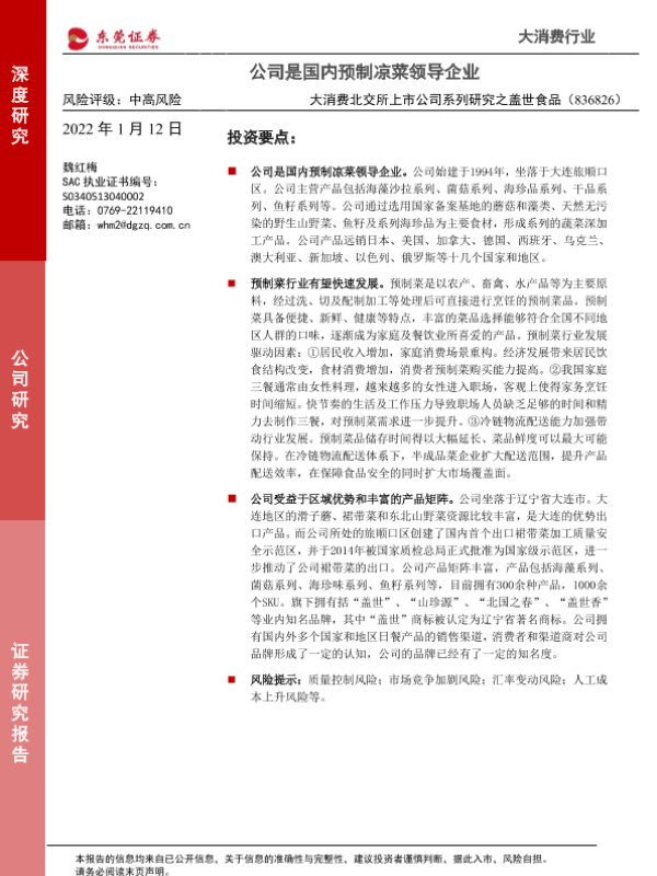 【东莞证券】【20220112】大消费北交所上市公司系列研究之盖世食品:公司是国内预制凉菜领导企业-20页