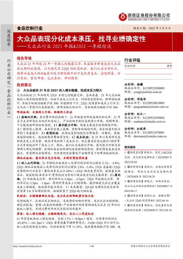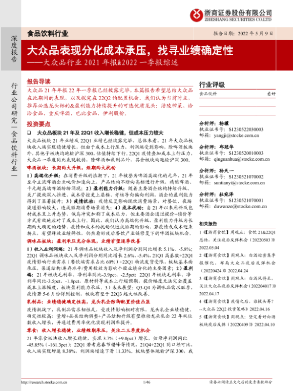 【浙商证券】【20220509】大众品行业2021年报&2022一季报综述:大众品表现分化成本承压,找寻业绩确定性-46页