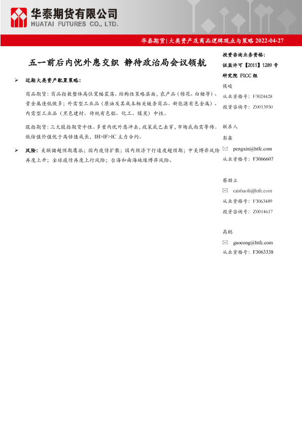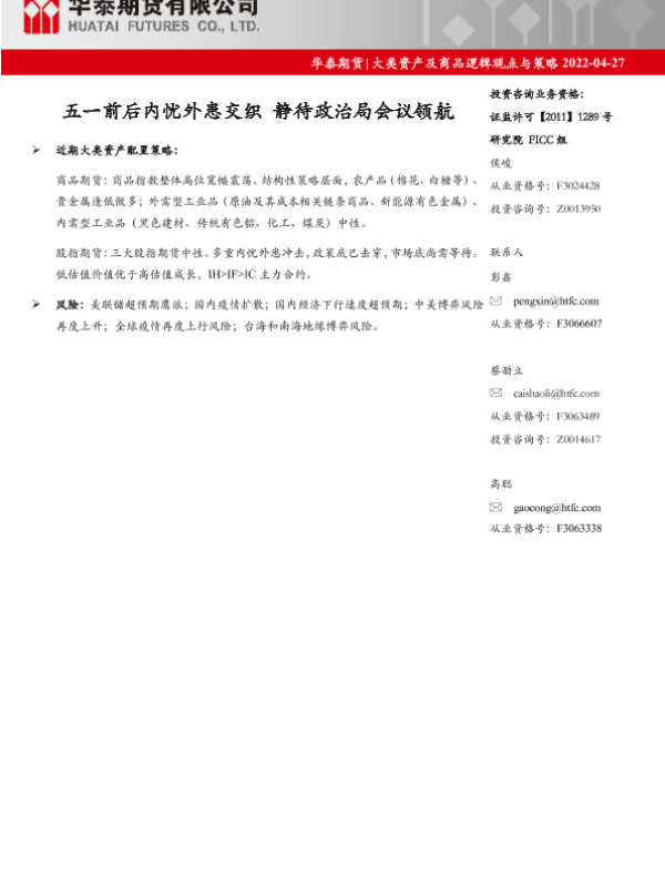 【华泰期货】【20220427】大类资产及商品逻辑观点与策略:五一前后内忧外患交织,静待政治局会议领航-59页