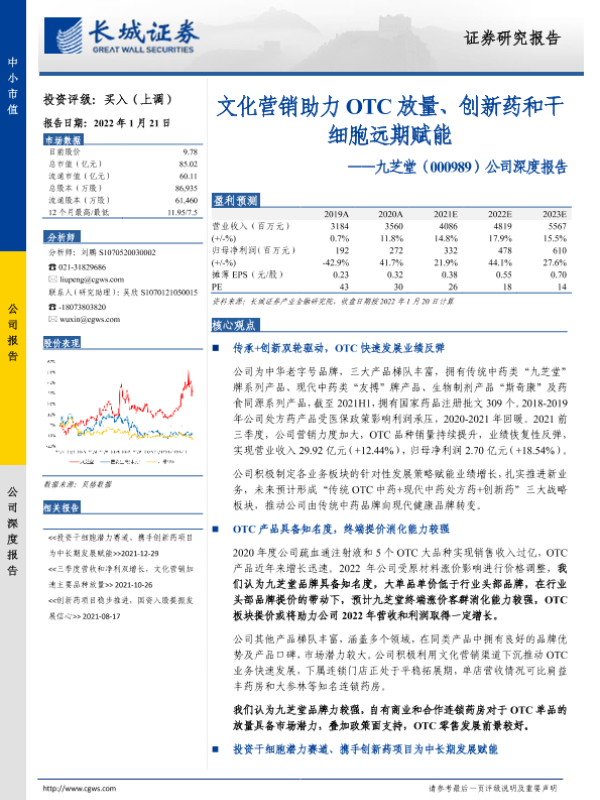 【长城证券】【20220121】20220121-长城证券-九芝堂-000989.SZ-公司深度报告:文化营销助力OTC放量、创新药和干细胞远期赋能-23页