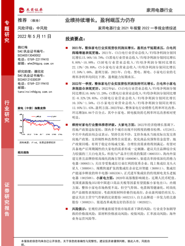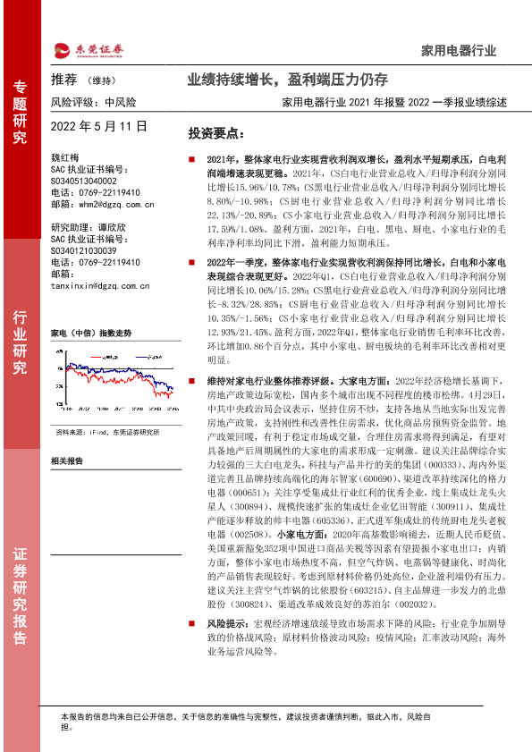 【东莞证券】【20220511】家用电器行业2021年报暨2022一季报业绩综述:业绩持续增长,盈利端压力仍存-29页