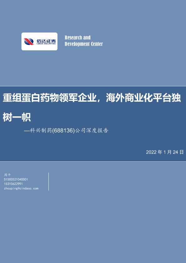 【信达证券】【20220124】20220124-信达证券-科兴制药-688136.SH-公司深度报告:重组蛋白药物领军企业,海外商业化平台独树一帜-22页
