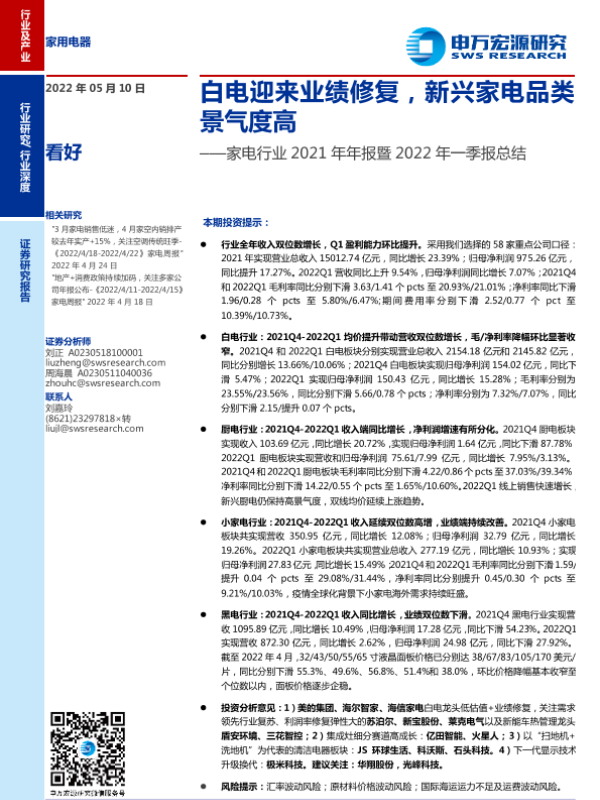 【申万宏源】【20220510】家电行业2021年年报暨2022年一季报总结:白电迎来业绩修复,新兴家电品类景气度高-29页