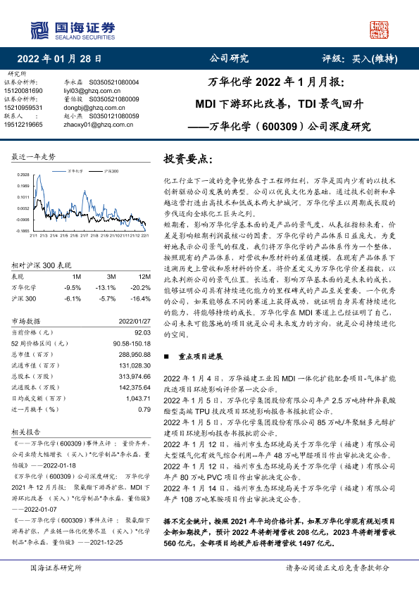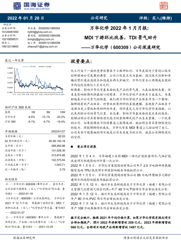 【国海证券】【20220128】万华化学2022年1月月报:MDI下游环比改善,TDI景气回升-30页
