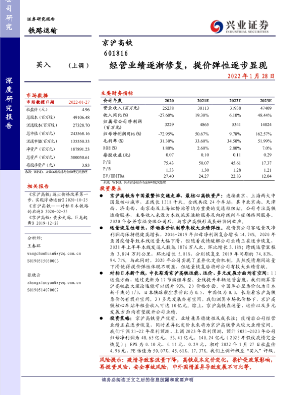 京沪高铁 票价改革 经营业绩 财务预测 运输服务
