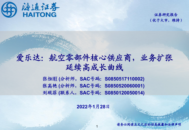 【海通证券】【20220128】爱乐达:航空零部件核心供应商,业务扩张延续高成长曲线-34页