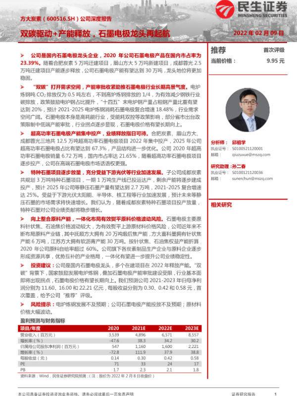 【民生证券】【20220209】方大炭素(600516.SH)公司深度报告:双碳驱动+产能释放,石墨电极龙头再起航-45页