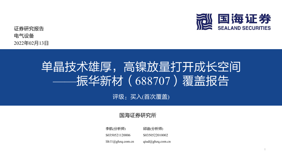 【国海证券】【20220213】单晶技术雄厚,高镍放量打开成长空间 ——振华新材(688707)覆盖报告-45页