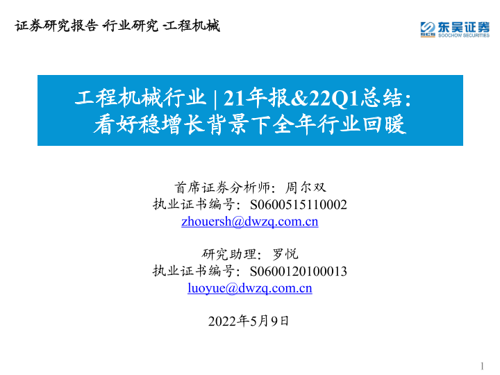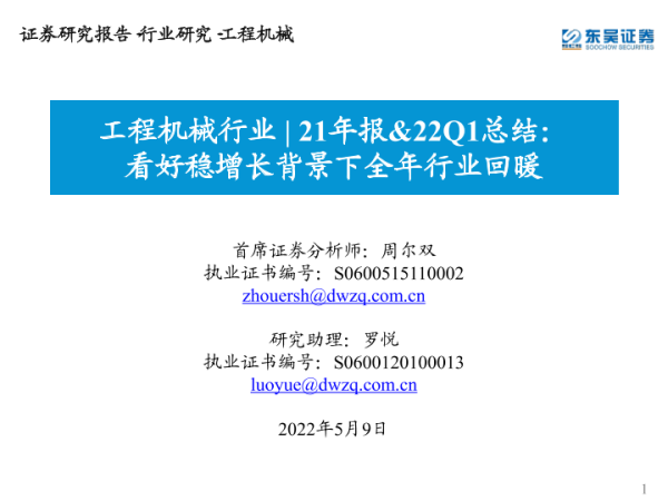 【东吴证券】【20220509】工程机械行业21年报&22Q1总结:看好稳增长背景下全年行业回暖-37页