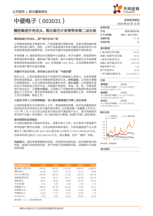 【天风证券】【20220215】中瓷电子-003031.SZ-精密陶瓷外壳龙头,氮化镓芯片有望带来第二成长极-26页