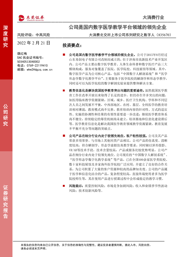 【东莞证券】【20220221】大消费北交所上市公司系列研究之数字人:公司是国内数字医学教学平台领域的领先企业-21页