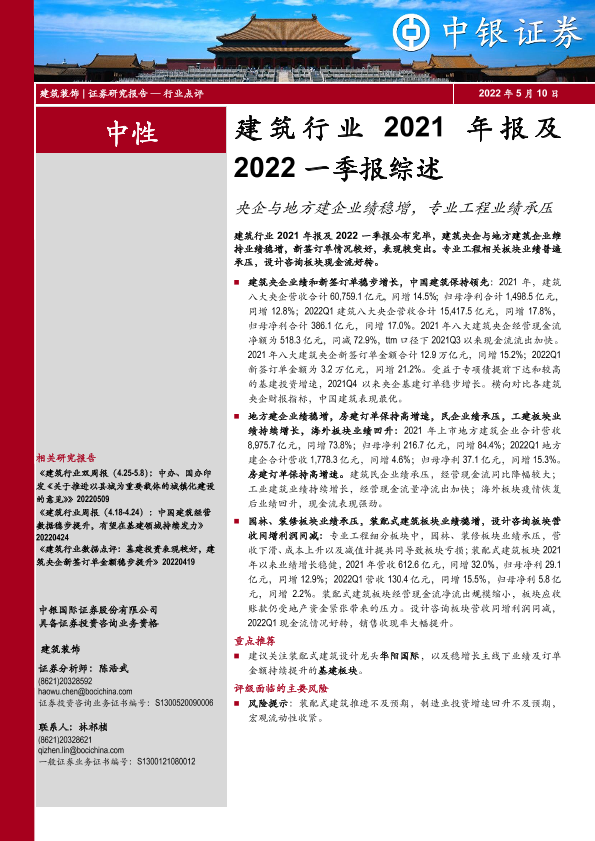 【中银证券】【20220510】建筑行业2021年报及2022一季报综述:央企与地方建企业绩稳增,专业工程业绩承压-20页