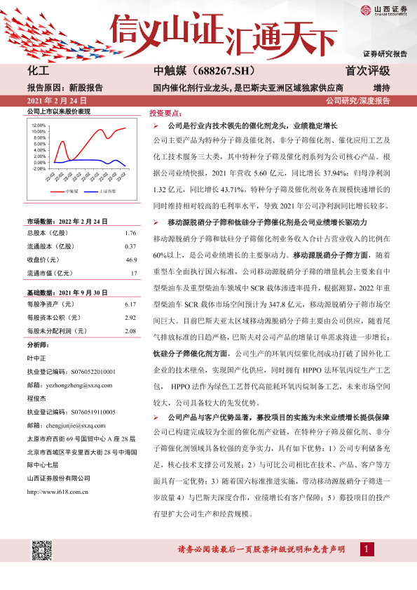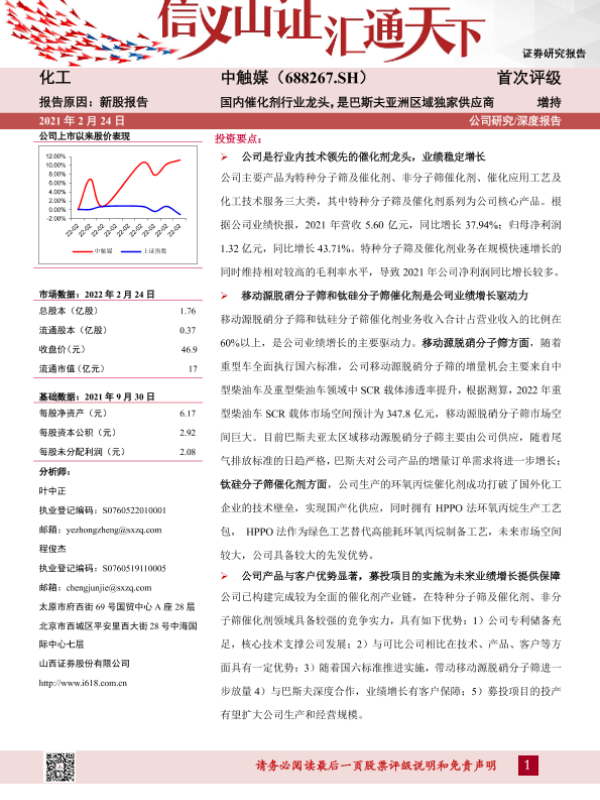 【山西证券】【20220224】中触媒-688267.SH-国内催化剂行业龙头,是巴斯夫亚洲区域独家供应商-29页