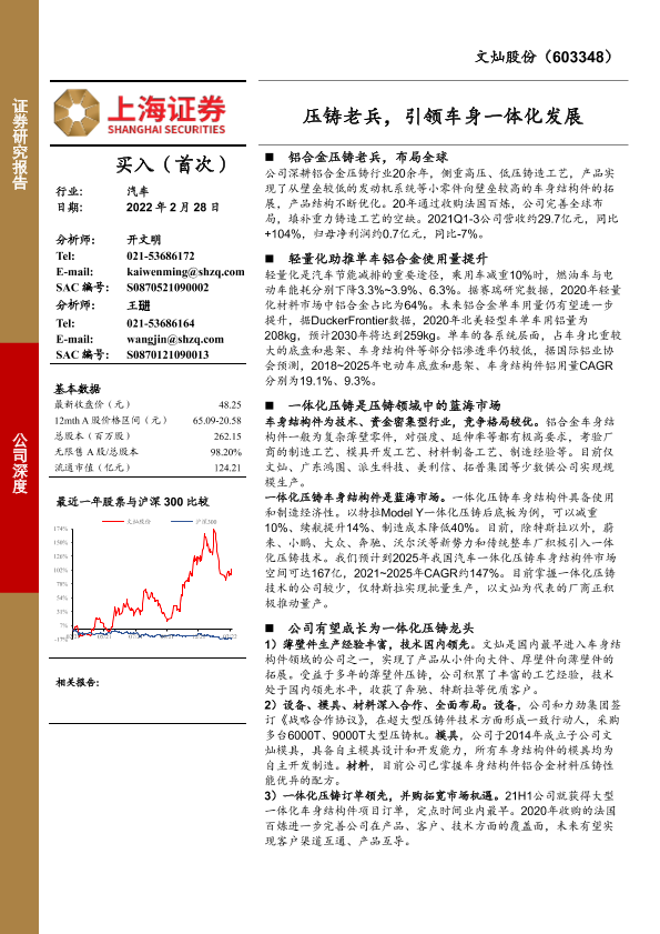 文灿股份 汽车行业 车身一体化 轻量化 铝合金压铸