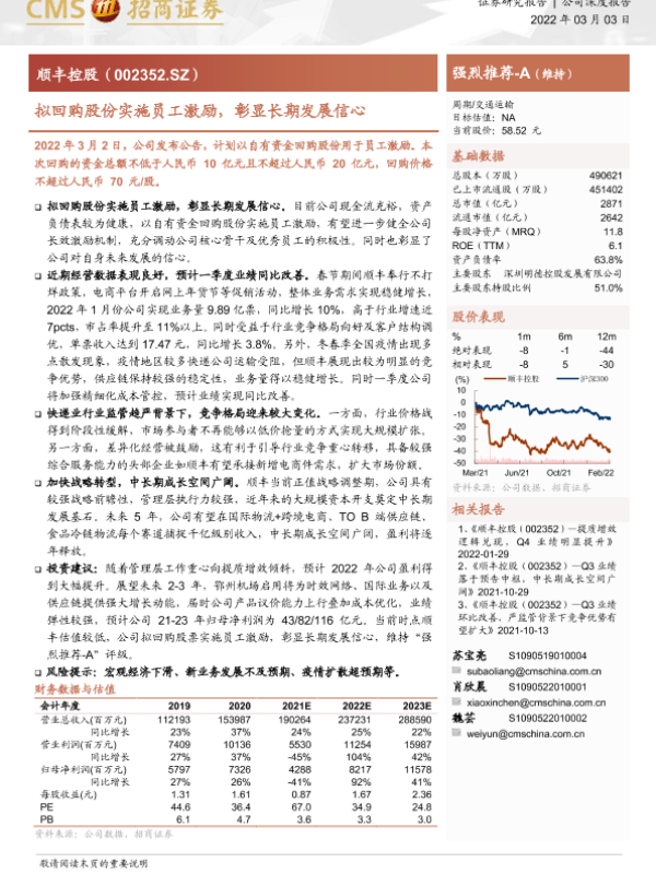 交通运输 员工激励 股份回购 长期发展信心 顺丰控股