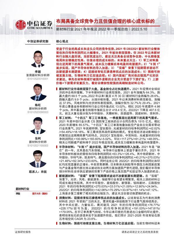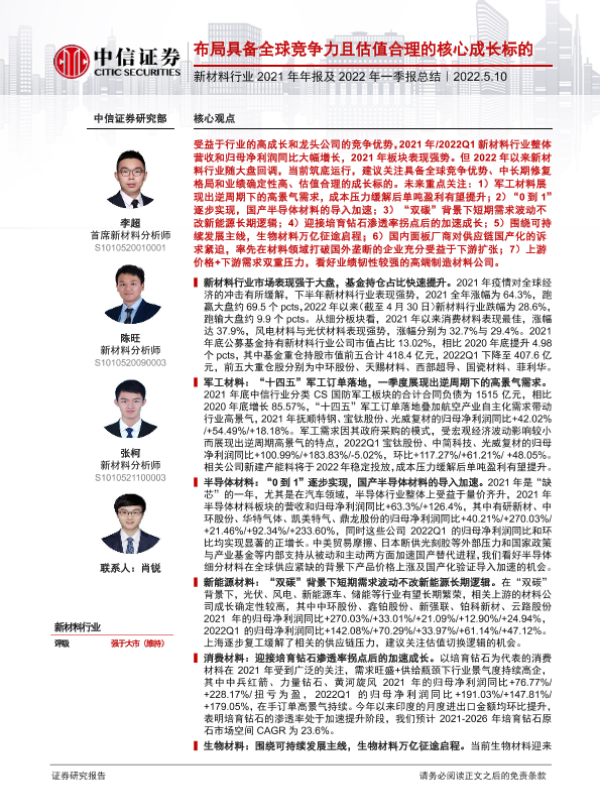 【中信证券】【20220510】新材料行业2021年年报及2022年一季报总结:布局具备全球竞争力且估值合理的核心成长标的-37页