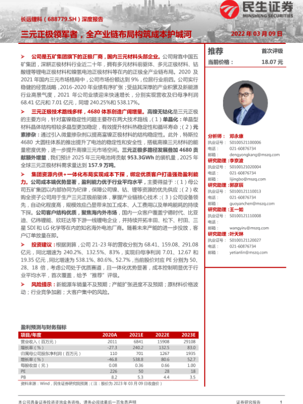【民生证券】【20220309】20220309-民生证券-长远锂科-688779.SH-深度报告:三元正极领军者,全产业链布局构筑成本护城河-35页