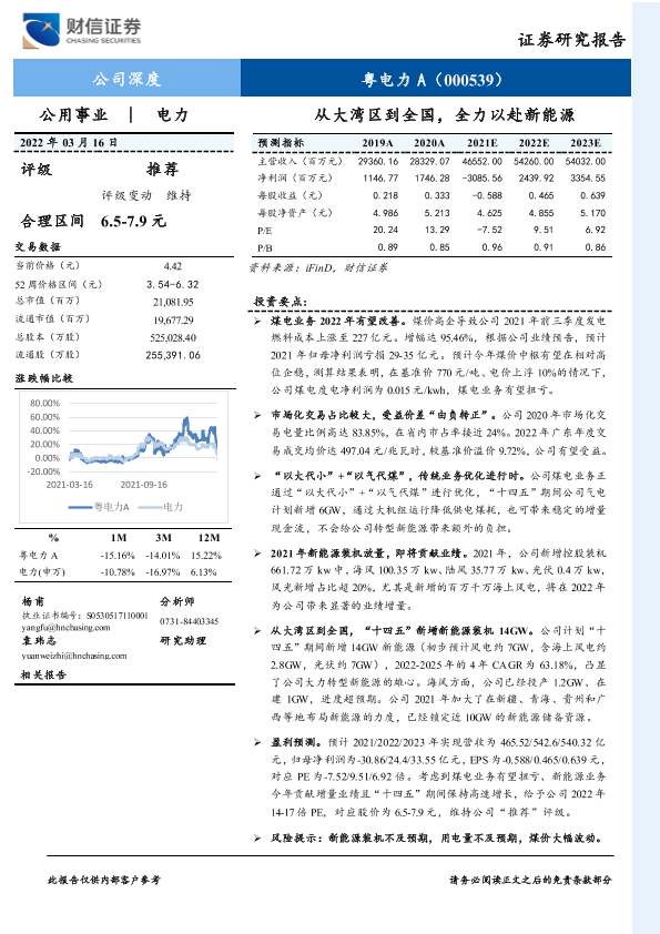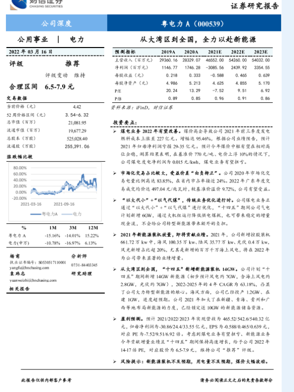 新能源 煤电业务 电力行业 粤港澳大湾区 财务预测