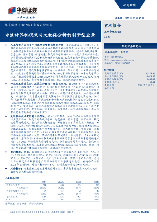 【华创证券】【20220317】20220317-华创证券-格灵深瞳-688207.SH-新股定价报告:专注计算机视觉与大数据分析的创新型企业-30页