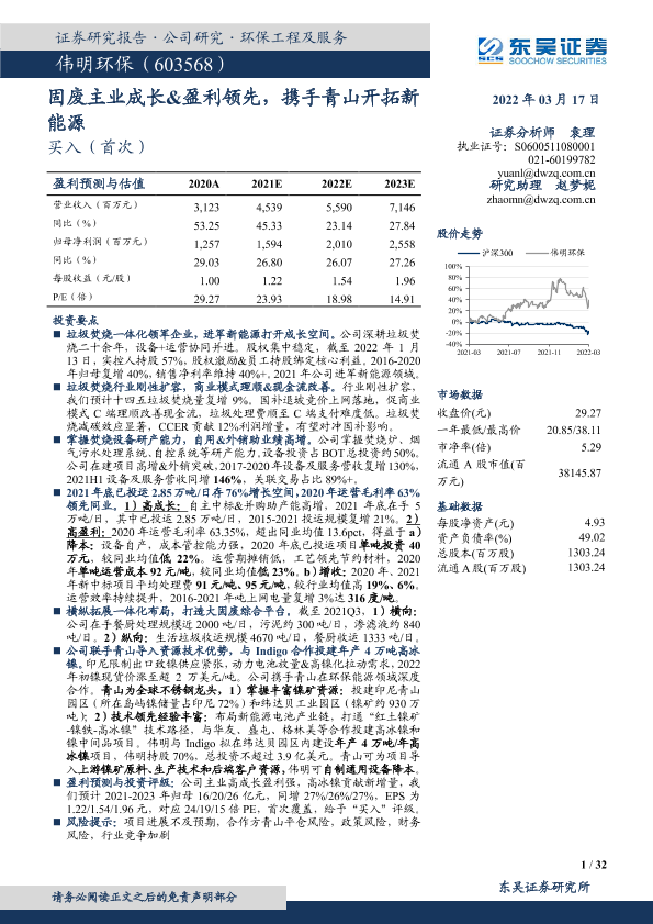 【东吴证券】【20220317】伟明环保-603568.SH-固废主业成长&盈利领先,携手青山开拓新能源-32页