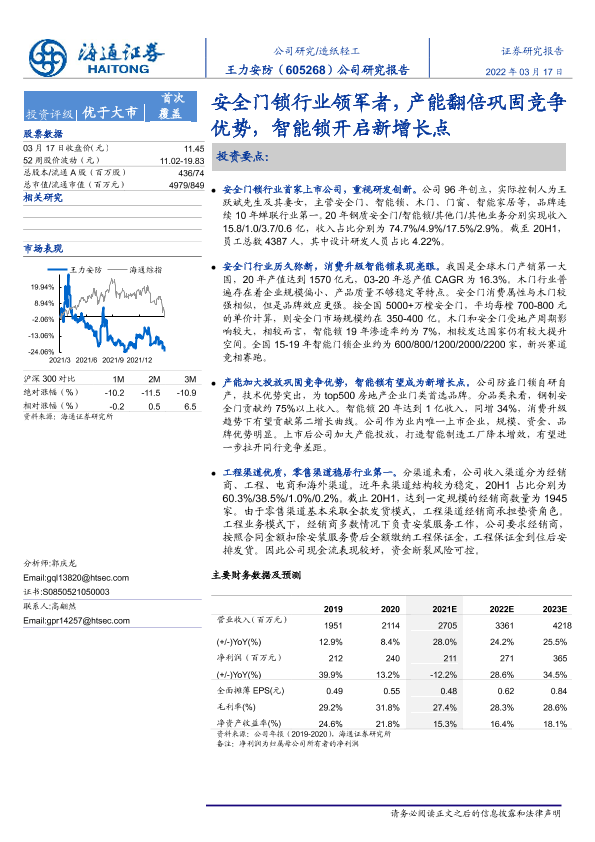 【海通证券】【20220317】20220317-海通证券-王力安防-605268.SH-公司研究报告:安全门锁行业领军者,产能翻倍巩固竞争优势,智能锁开启新增长点-32页