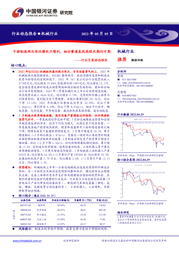 【银河证券】【20220505】机械行业月度动态报告:中游制造两头承压增收不增利,细分赛道表现亮眼长期仍可期-29页