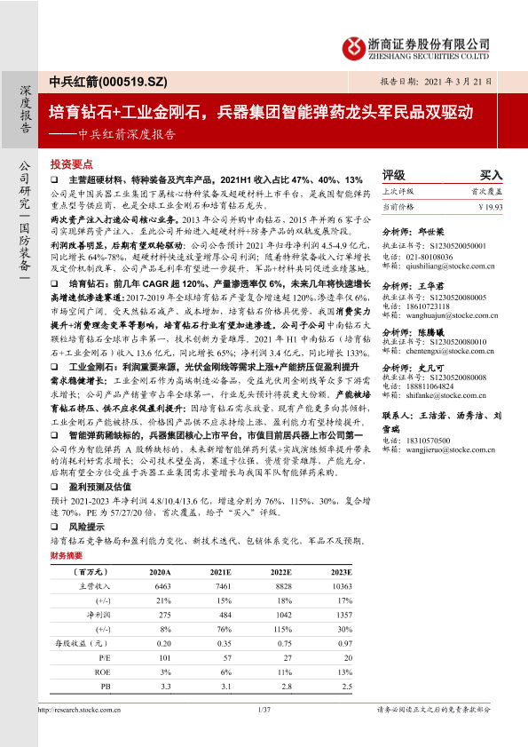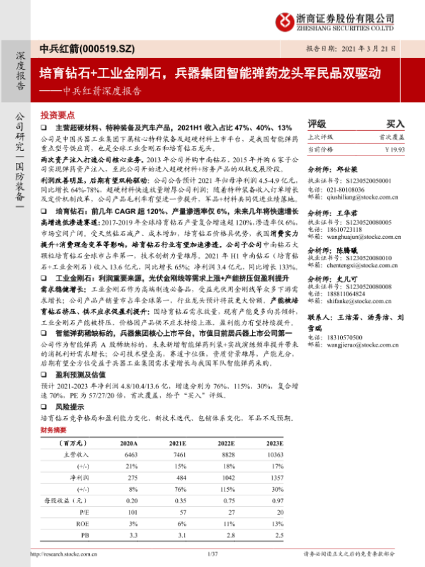 【浙商证券】【20220321】中兵红箭深度报告:培育钻石+工业金刚石,兵器集团智能弹药龙头军民品双驱动-37页
