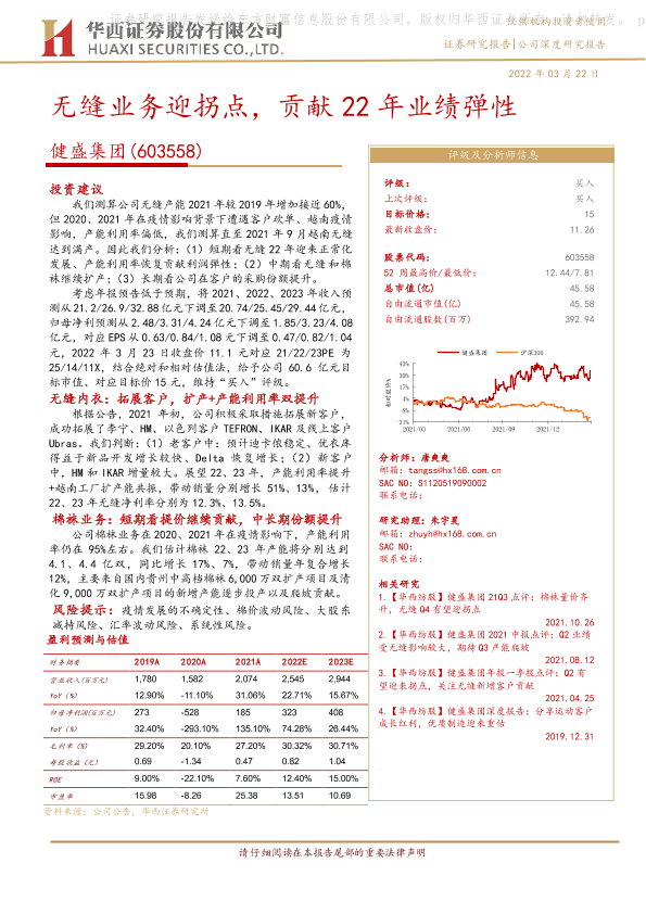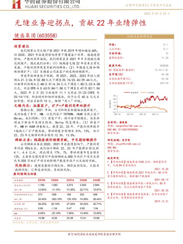 产能扩张 健盛集团 无缝业务 棉袜业务 财务预测