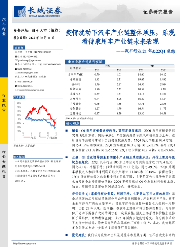 【长城证券】【20220511】汽车行业21年&22Q1总结:疫情扰动下汽车产业链整体承压,乐观看待乘用车产业链未来表现-22页