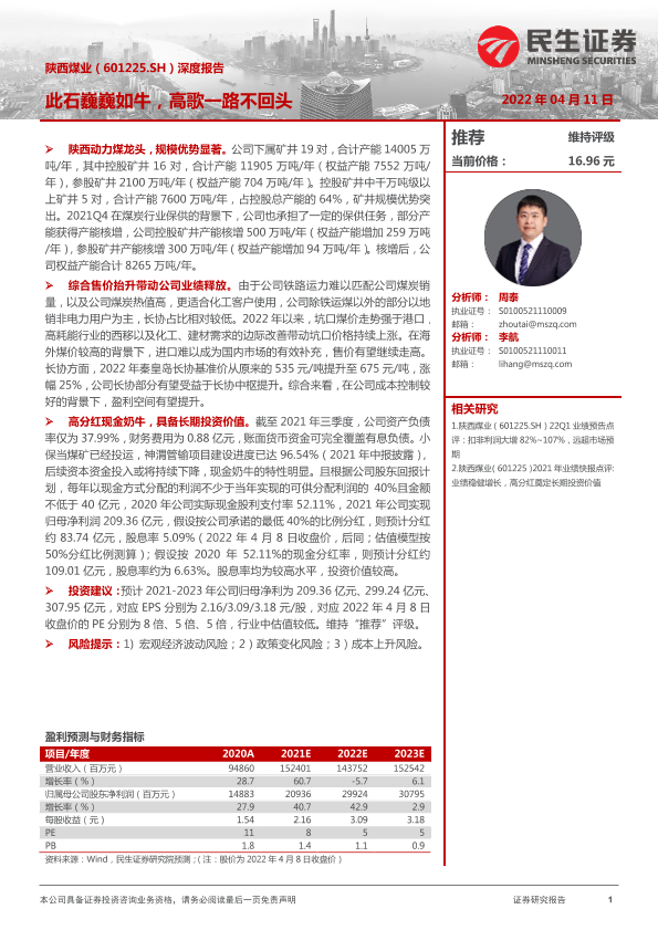 【民生证券】【20220411】20220411-民生证券-陕西煤业-601225.SH-深度报告:此石巍巍如牛,高歌一路不回头-19页