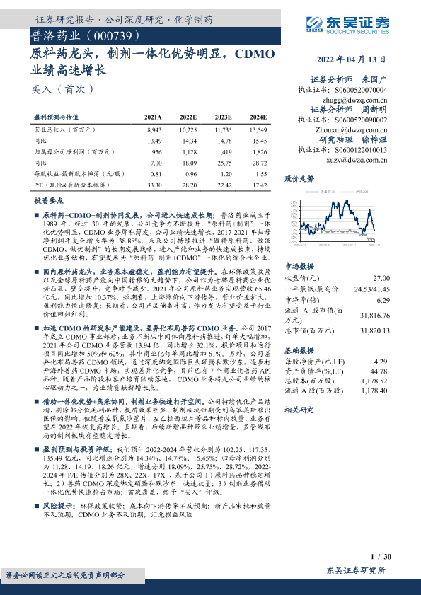 【东吴证券】【20220413】普洛药业-原料药龙头,制剂一体化优势明显,CDMO业绩高速增长-30页