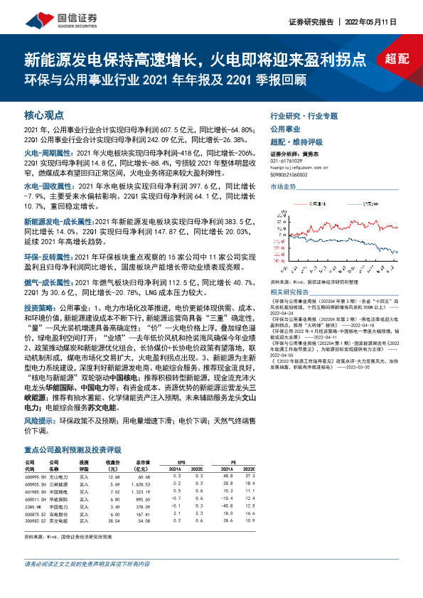 【国信证券】【20220511】环保与公用事业行业2021年年报及22Q1季报回顾:新能源发电保持高速增长,火电即将迎来盈利拐点-31页