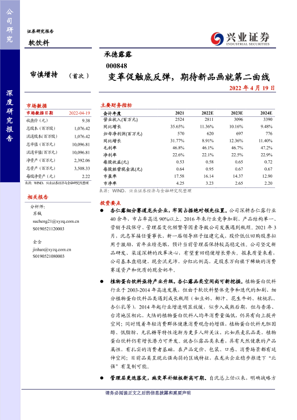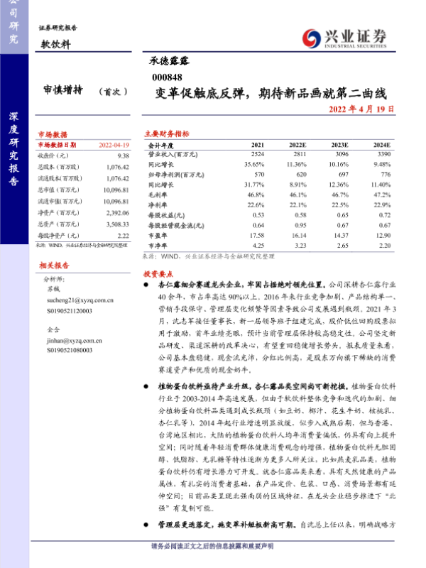 兴业证券 承德露露 杏仁露 植物蛋白饮料 财务分析
