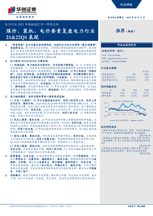【华创证券】【20220511】电力行业2021年报&2022年一季报总结:煤价、装机、电价要素复盘电力行业21&22Q1表现-23页