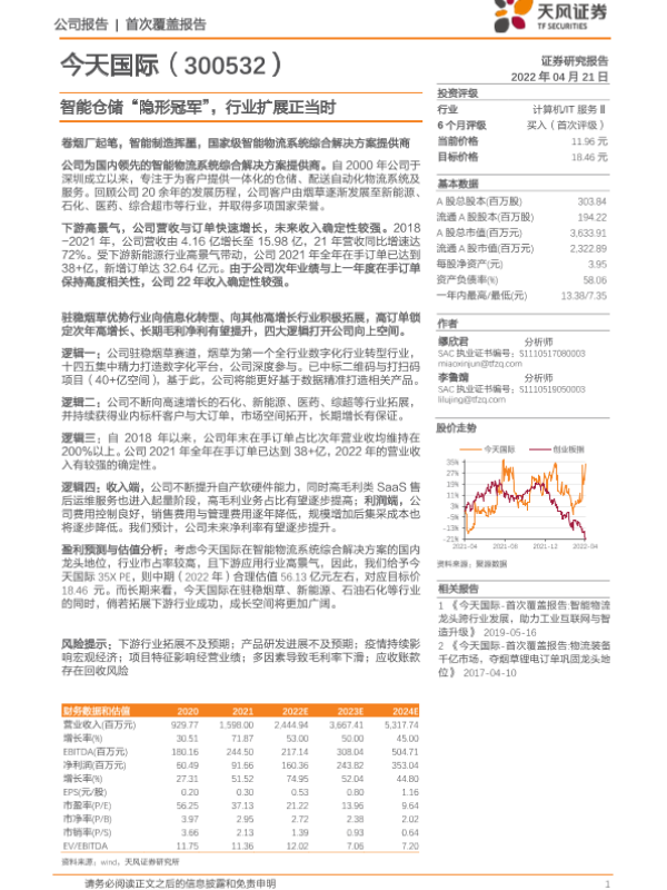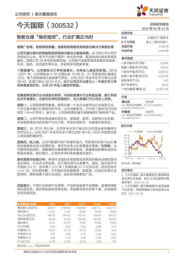 【天风证券】【20220421】今天国际-300532.SZ-智能仓储“隐形冠军”,行业扩展正当时-33页