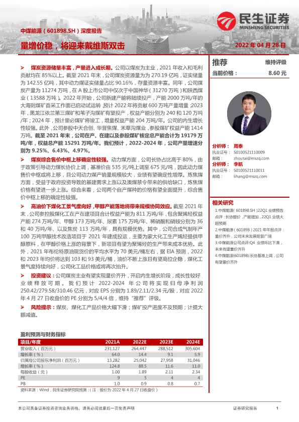 【民生证券】【20220428】中煤能源(601898.SH)深度报告:量增价稳,将迎来戴维斯双击-26页