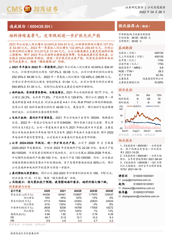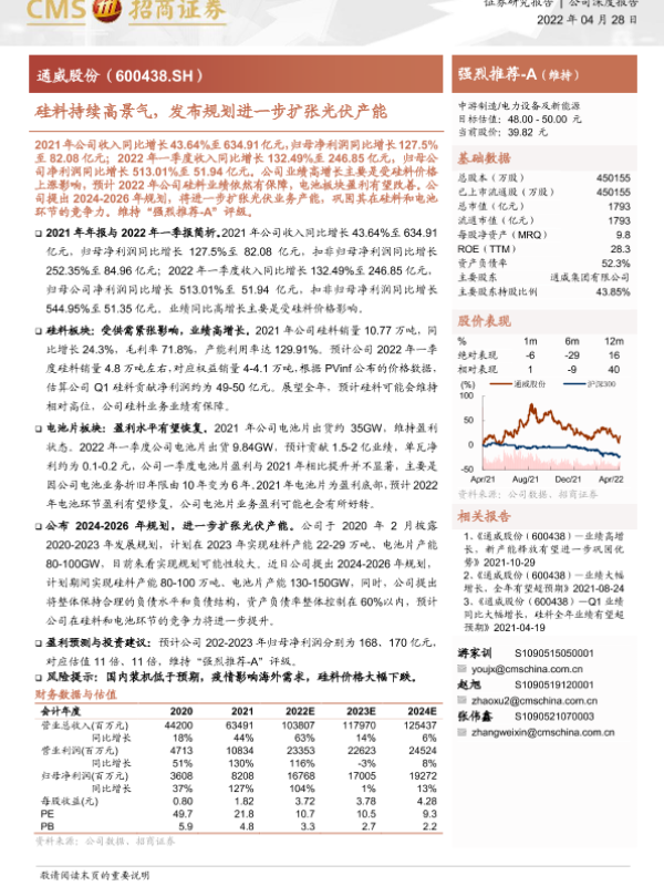 【海通证券】【20220428】通威股份-硅料持续高景气,发布规划进一步扩张光伏产能-16页