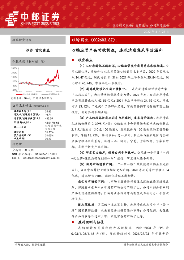 【中邮证券】【20220429】以岭药业-002603.SZ-心脑血管产品营收提速,连花清瘟集采降价温和-23页